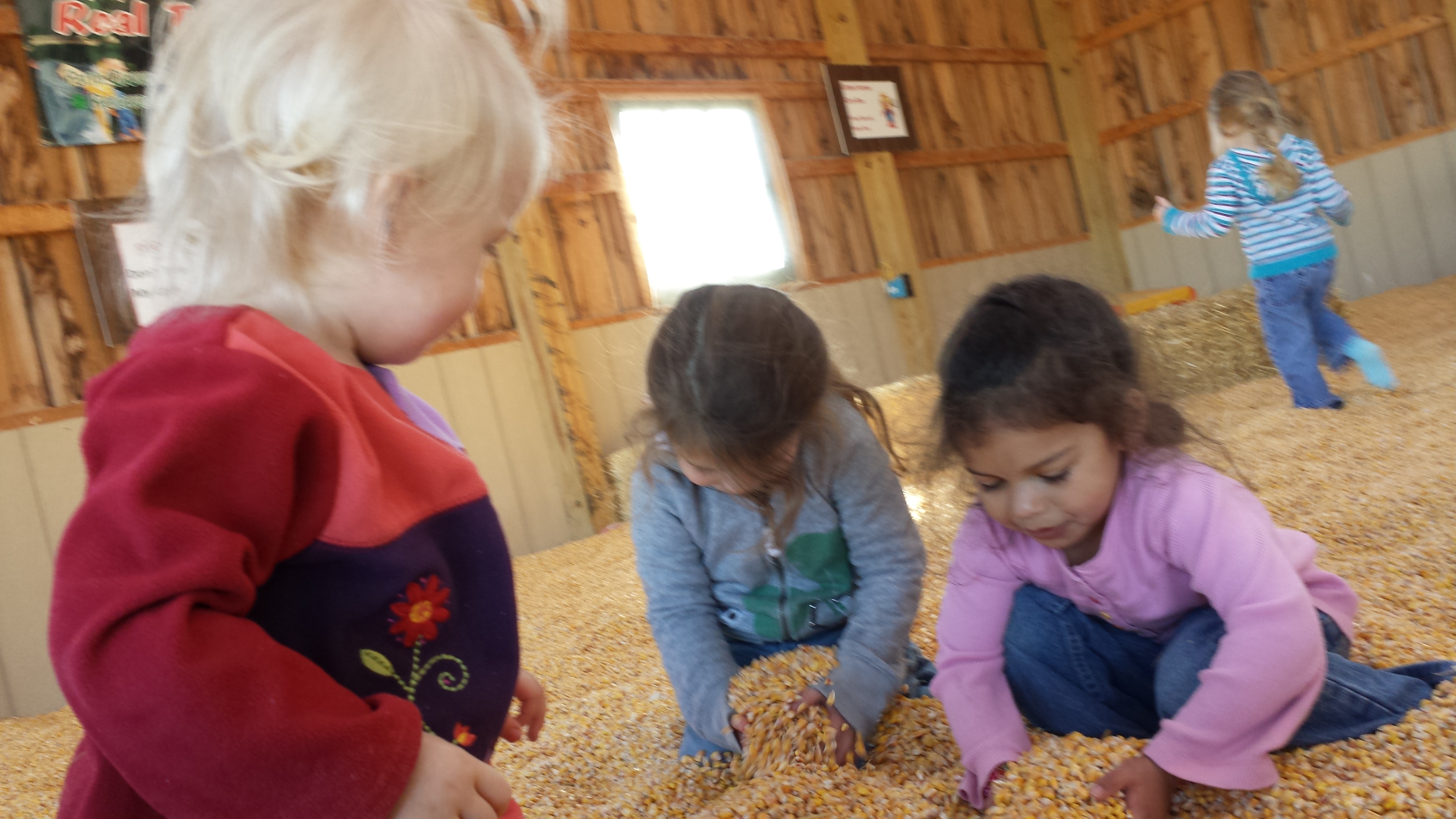 Jasmin and Beth playing in a giant sandbox full of corn at Stokoe Farm